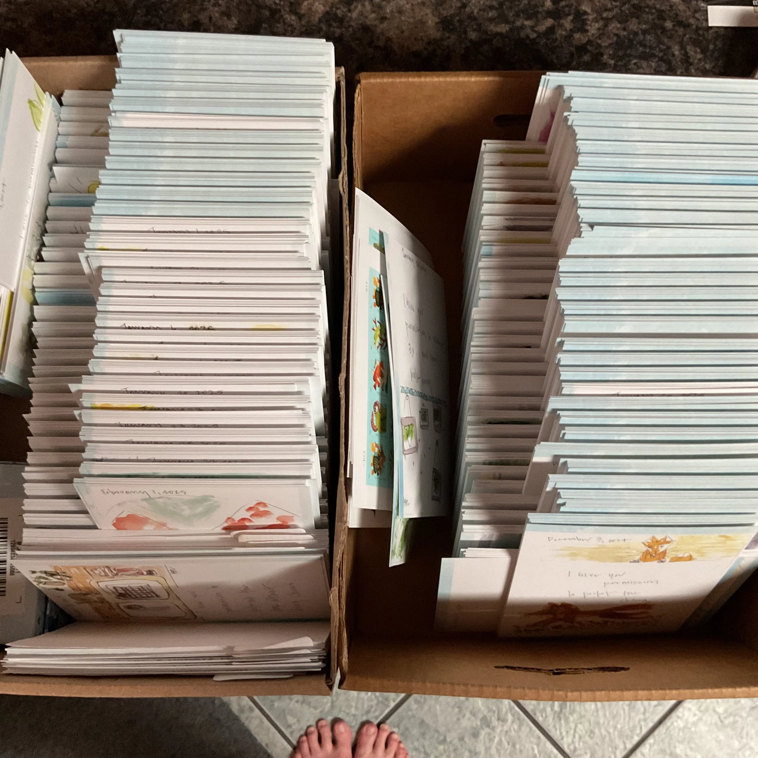 Each postcard is a work of art in process. You are a part of this postcards art journey. Ive pen and ink drawn and given permission. watercolored, sometimes videoed, photographed the process of, signed and dated. physical copies taken to the printer. postcards made of scanned image. once again signed and dated, postcards sent through the USPS. federal mail, and now we have a certified poor-man copyright. Join me on this Passing Notes postcard to completion of becoming “Real”.